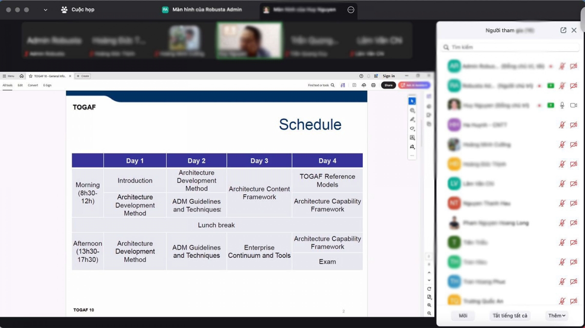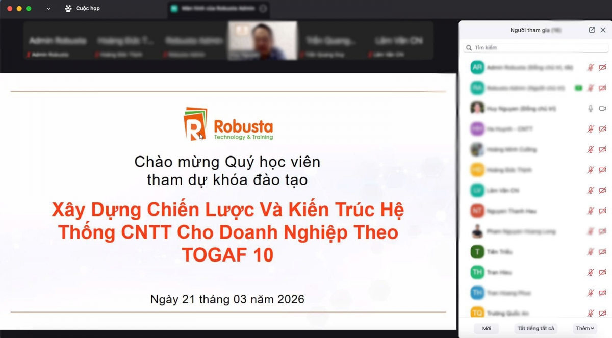 Ngày 21/03/2026 vừa qua, Robusta đã chính thức khai giảng khóa học “Xây dựng Chiến lược và Kiến trúc Hệ thống CNTT cho Doanh nghiệp theo TOGAF 10” với hình thức đào tạo online tương tác trực tiếp cùng giảng viên. Đây là chương trình đào tạo chuyên sâu, được thiết kế dựa trên chuẩn TOGAF Version 10 của Open Group – khung kiến trúc tổng thể phổ biến và được áp dụng rộng rãi nhất trên thế giới hiện nay.