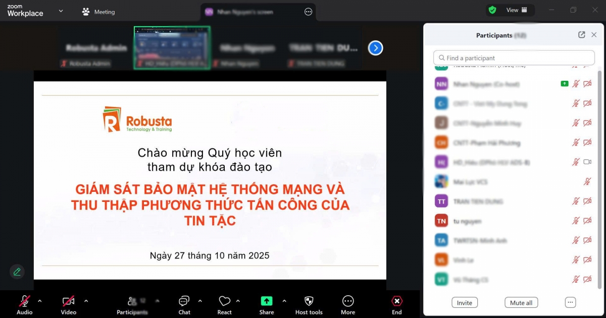 Ngày 27/10/2025, Robusta đã khai giảng khóa đào tạo “Giám sát bảo mật hệ thống mạng và thu thập phương thức tấn công của tin tặc”, được tổ chức theo hình thức kết hợp offline và online tại văn phòng khách hàng, dành riêng cho đội ngũ nhân sự IT của một đơn vị quản lý và khai thác trong lĩnh vực hàng không.