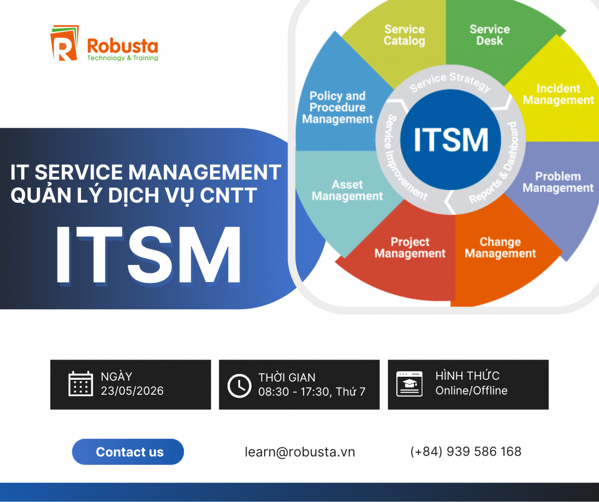 Khóa học Quản Lý Dịch Vụ CNTT (ITSM) tại Robusta sẽ trang bị cho học viên nền tảng vững chắc và kiến thức chuyên sâu, giúp nâng cao hiệu quả hoạt động CNTT trong doanh nghiệp và còn đáp ứng nhanh chóng và hiệu quả nhất nhu cầu của thị trường trong thời đại số hóa.