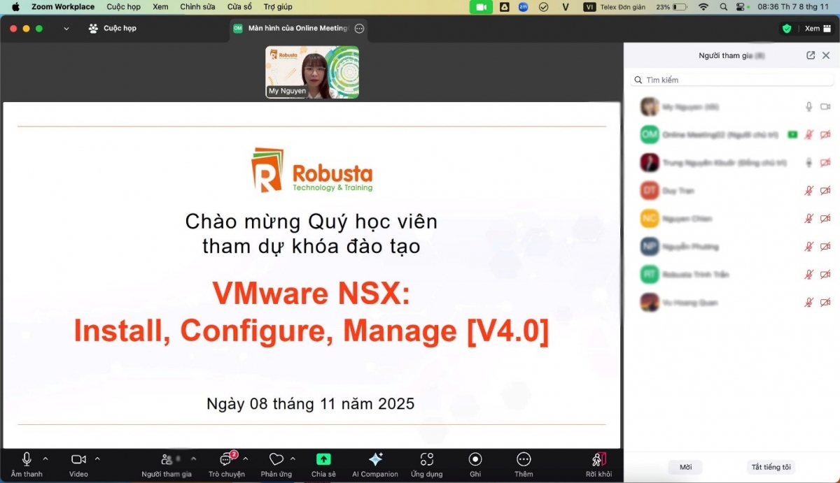 Ngày 08/11/2025, Robusta đã khai giảng khóa đào tạo “VMware NSX Install, Configure, Manage [V4.0]” theo hình thức học online trực tuyến. Khóa học được thiết kế chuyên sâu cho các kỹ sư hệ thống, quản trị viên mạng và chuyên viên bảo mật đang làm việc trong các tổ chức có hạ tầng ảo hóa phức tạp, có nhu cầu triển khai, vận hành và bảo mật hệ thống mạng dựa trên nền tảng VMware NSX hiện đại.
