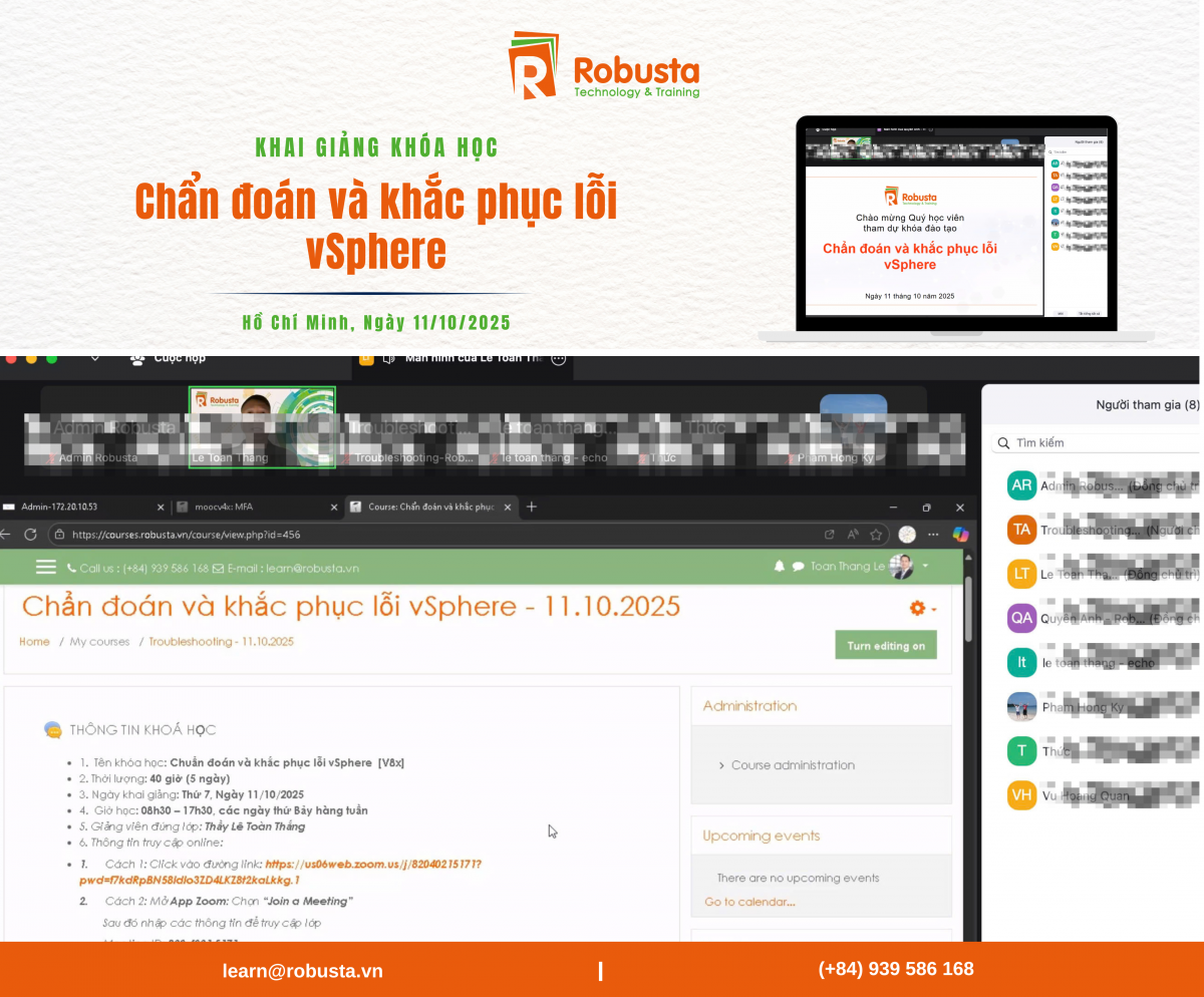 Trong bối cảnh công nghệ phát triển nhanh và doanh nghiệp liên tục chuyển đổi mô hình hạ tầng, đào tạo chuyên sâu về công nghệ thông tin trở thành nhu cầu cấp thiết. Nhằm đáp ứng nhu cầu đó, Robusta Technology & Training – đơn vị đào tạo uy tín trong lĩnh vực CNTT – liên tục khai giảng các khóa học chuyên sâu như Chẩn đoán và khắc phục lỗi VMware vSphere [v6.x], Quản trị Oracle Database 19c SQL Tuning Workshop, Microsoft 365 Administrator (MS-102), Certified Information Systems Security Professional (CISSP), và đặc biệt là chuỗi chương trình Generative AI Thực Chiến dành cho các đơn vị quản lý trong lĩnh vực hàng không.