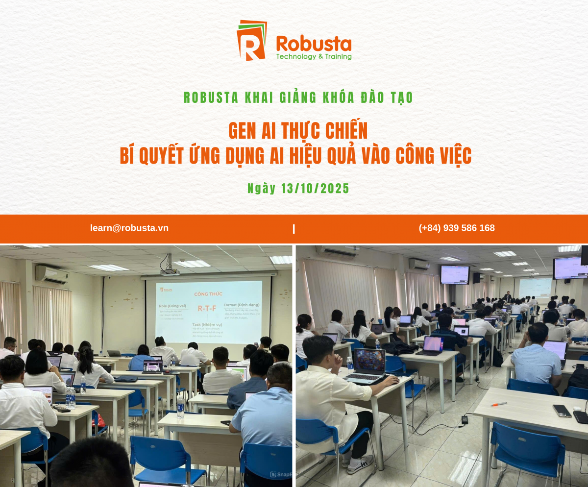 Gần đây, Robusta đã triển khai thành công khóa học “Gen AI Thực Chiến – Kiến thức cơ bản AI và Ứng dụng gia tăng hiệu quả công việc” và “Gen AI Thực Chiến – Ứng dụng AI hiệu quả” cho các đơn vị quản lý trong lĩnh vực hàng không tại Việt Nam.