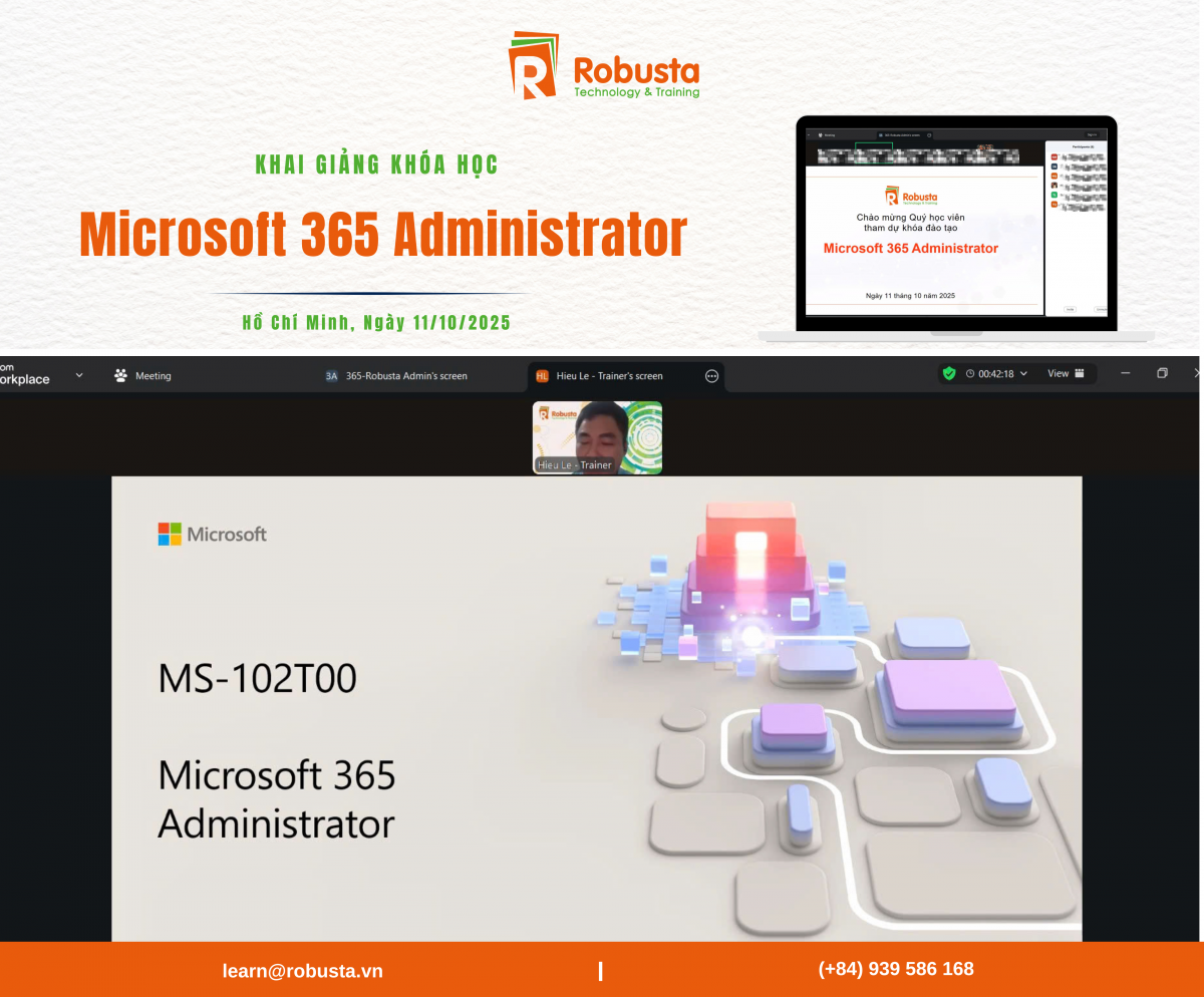 - Khóa “Microsoft 365 Administrator (MS-102)” hướng tới đội ngũ quản trị viên hạ tầng doanh nghiệp đang triển khai hoặc vận hành môi trường Microsoft 365. Học viên được hướng dẫn toàn diện từ thiết lập tenant, quản lý danh tính, bảo mật, đến vận hành dịch vụ Microsoft Defender, Purview, Azure AD, và Data Loss Prevention. Khóa học giúp học viên không chỉ nắm vững kỹ thuật quản trị, mà còn hiểu cách tối ưu mô hình Zero Trust trong doanh nghiệp hiện đại.