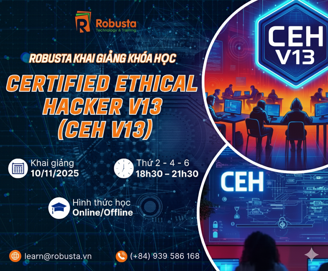 Với Certified Ethical Hacker (CEH) v13, học viên sẽ được học lý thuyết và thực hành trực tiếp trên hệ thống Lab thực tế được thiết kế chuyên nghiệp tại Robusta. Đặc biệt, Robusta là đối tác đào tạo chính thức của EC-Council tại Việt Nam, luôn đi đầu trong lĩnh vực đào tạo an ninh mạng và công nghệ thông tin.