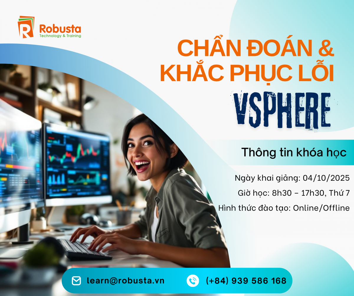 Khóa học “Chẩn đoán và khắc phục lỗi VMware vSphere [v6.x]” tại Robusta được thiết kế dành riêng cho quản trị viên hệ thống, kỹ sư vận hành và hỗ trợ kỹ thuật. Khóa học không chỉ cung cấp kiến thức lý thuyết mà tập trung rèn luyện kỹ năng thực hành xử lý sự cố, giúp học viên chủ động xử lý các tình huống thực tế, từ đơn giản đến phức tạp trong môi trường VMware vSphere 6.x.