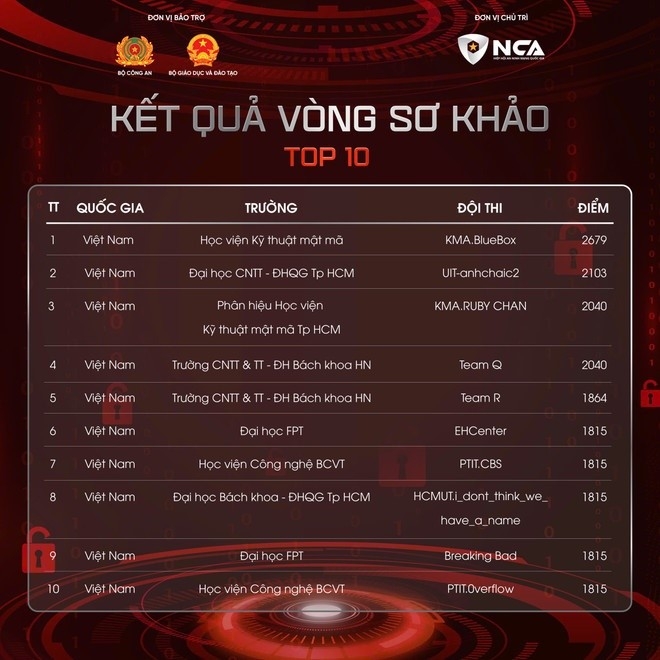 Vòng Sơ khảo Cuộc thi Sinh viên An ninh mạng 2025 đã khép lại với sự áp đảo tuyệt đối của các đội tuyển Việt Nam, chiếm trọn 10 vị trí dẫn đầu trên bảng xếp hạng quốc tế. Đội BlueBox thuộc Học viện Kỹ thuật Mật mã đã xuất sắc giành ngôi vị quán quân sau khi chinh phục 18/21 thử thách. Cuộc thi năm nay được giới chuyên môn đánh giá cao nhờ các kịch bản tấn công và phòng thủ mạng mô phỏng sát với thực tế, đòi hỏi kỹ năng chuyên sâu. 20 đội tuyển có thành tích tốt nhất sẽ chính thức bước vào Vòng Chung kết, hứa hẹn một cuộc đối đầu đỉnh cao về trí tuệ và kỹ năng an ninh mạng.