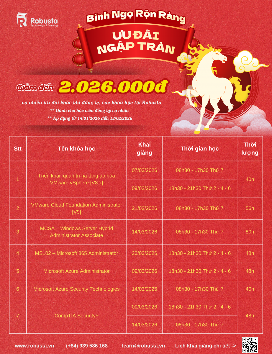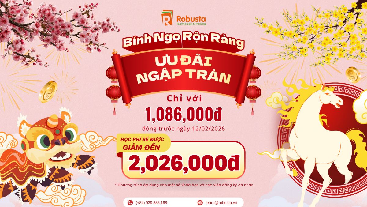 Khởi đầu năm mới không chỉ là thời khắc sum vầy, mà còn là thời điểm vàng để đầu tư cho tri thức và sự nghiệp. Thấu hiểu điều đó, Robusta chính thức triển khai Chương trình ưu đãi đầu năm 2026 – món quà tri thức mang ý nghĩa bình an – tài lộc – thăng tiến dành riêng cho cộng đồng học viên đam mê công nghệ thông tin.