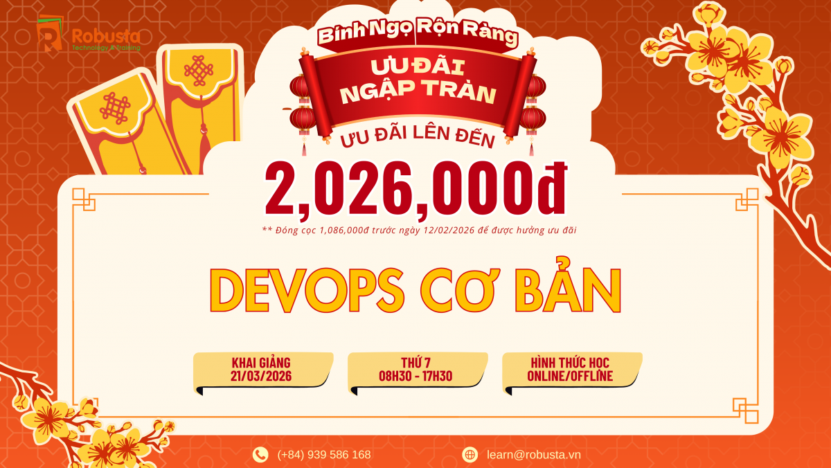 Trong dịp Xuân Bính Ngọ 2026, việc bắt đầu hành trình DevOps còn trở nên “dễ chịu” hơn khi Robusta triển khai chương trình ưu đãi đầu năm – vừa giúp bạn giữ chỗ học tập, vừa tối ưu chi phí đầu tư cho tri thức.