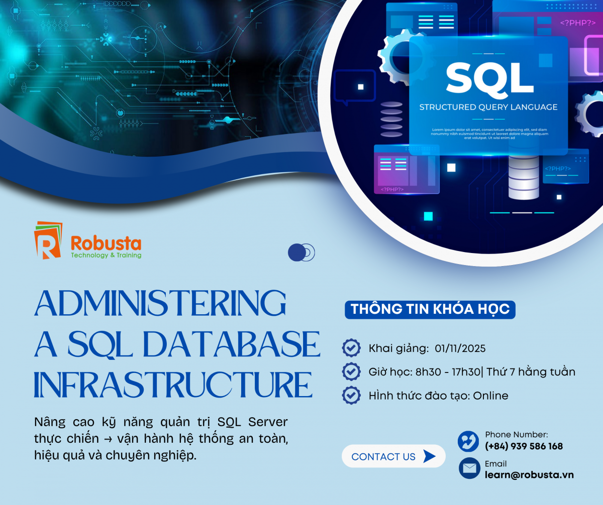 Hiểu rõ nhu cầu đó, khóa học “Administering a SQL Database Infrastructure” tại Robusta được thiết kế như một chương trình đào tạo toàn diện và thực tiễn. Trong 40 giờ học tập chuyên sâu, học viên sẽ được trang bị từ kiến thức nền tảng đến các kỹ năng nâng cao trong quản lý hệ thống cơ sở dữ liệu SQL Server. Từ xây dựng chiến lược bảo mật, thực hiện backup–restore hiệu quả, đến tự động hóa công việc với SQL Server Agent và PowerShell, khóa học giúp học viên vận hành hệ thống chuyên nghiệp, an toàn và tối ưu hơn – sẵn sàng xử lý các tình huống phức tạp trong môi trường doanh nghiệp hiện đại.