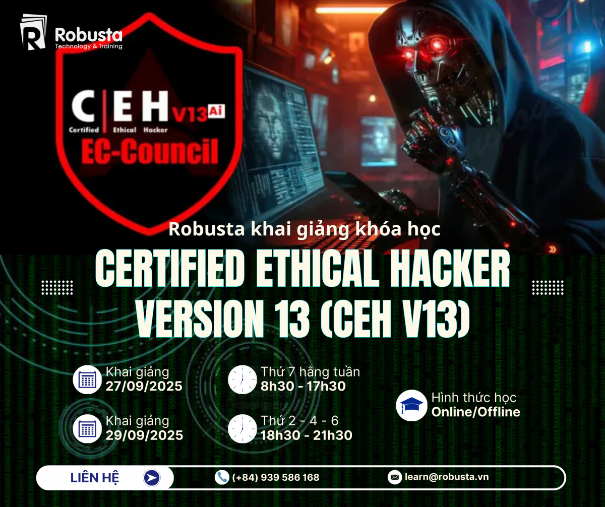 Robusta triển khai chương trình ưu đãi đặc biệt dành cho học viên đăng ký khóa Certified Ethical Hacker v13 (CEH v13) – chứng chỉ hàng đầu thế giới về Ethical Hacking và Cybersecurity. Đây là cơ hội để bạn vừa tiết kiệm chi phí, vừa trang bị kỹ năng bảo mật tiên tiến, bắt kịp xu thế an ninh mạng trong kỷ nguyên AI.