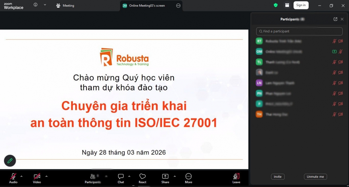 Ngày 28/03/2026 vừa qua, Robusta đã chính thức khai giảng khóa học “Chuyên gia triển khai An toàn thông tin ISO/IEC 27001:2022” với hình thức đào tạo kết hợp online và offline tại văn phòng Robusta TP.HCM. Đây là chương trình đào tạo chuyên sâu kéo dài 5 ngày (40 giờ), hướng đến việc giúp học viên làm chủ phương pháp triển khai Hệ thống Quản lý An toàn Thông tin (ISMS) theo tiêu chuẩn quốc tế mới nhất.