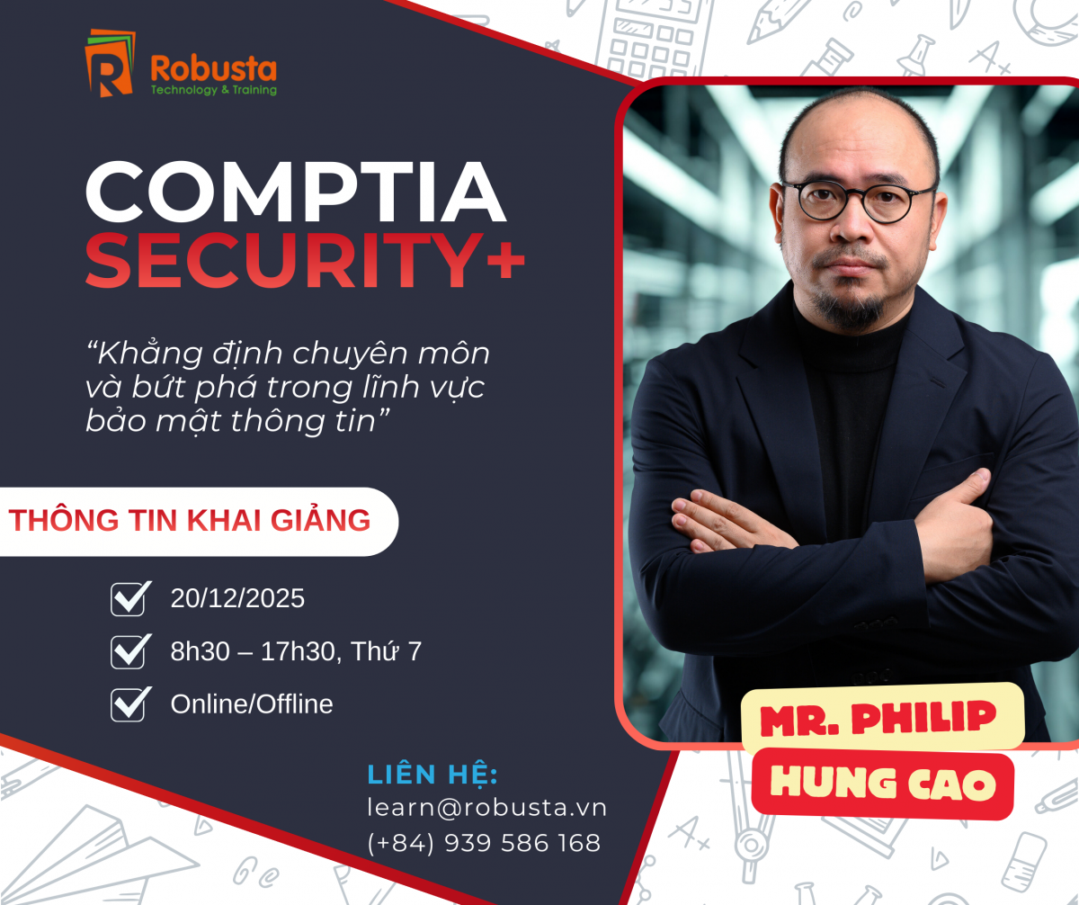 Bạn có muốn trở thành chuyên gia an ninh mạng với cơ hội nghề nghiệp rộng mở? Chứng chỉ CompTIA Security+ (SY0-701) chính là bước đệm hoàn hảo để bạn xây dựng nền tảng vững chắc, khẳng định chuyên môn và bứt phá trong lĩnh vực bảo mật thông tin. Hãy tham gia khóa học CompTIA Security+ tại Robusta để trang bị kiến thức chuyên sâu, kỹ năng thực tiễn và sẵn sàng chinh phục kỳ thi SY0-701!