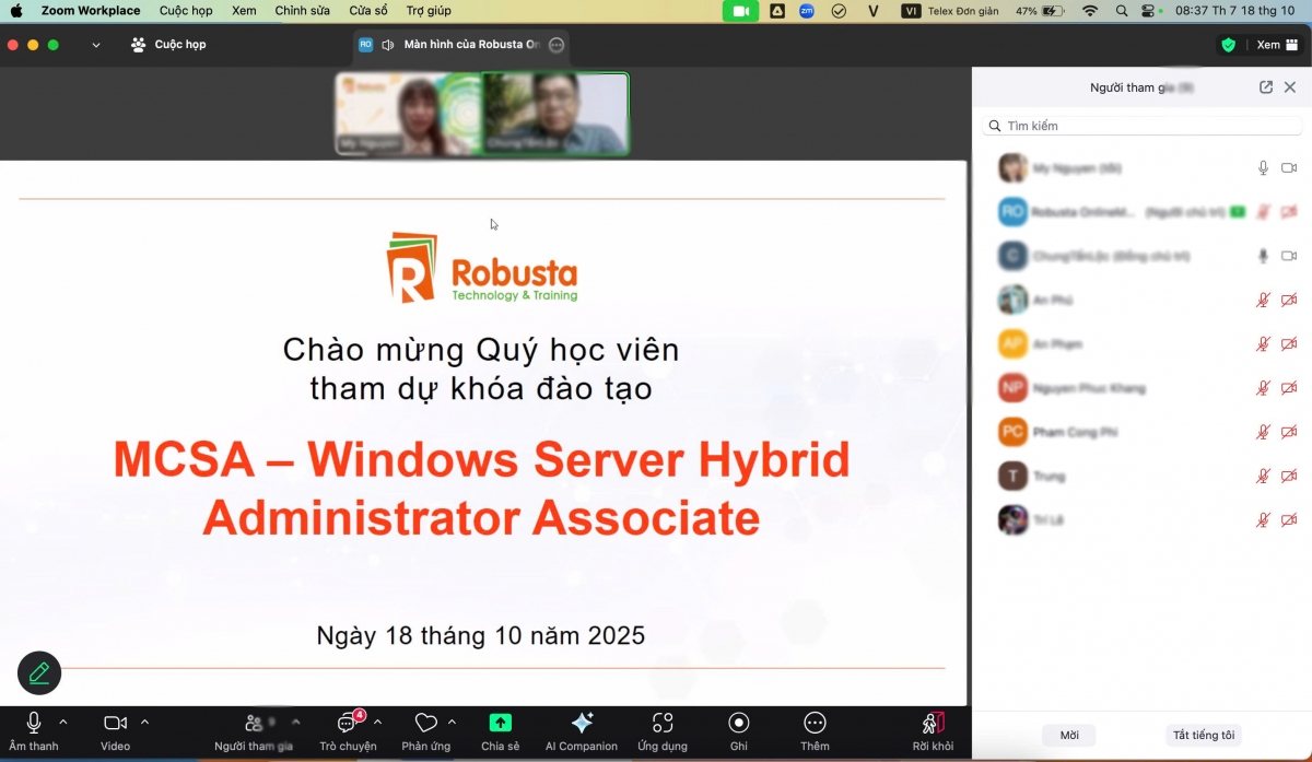 Vào lúc 8h15 sáng ngày 18/10/2025 Robusta đã khai giảng lớp học "MCSA – Windows Server Hybrid Administrator Associate". Với hình thức đào tạo trực tuyến, tạo điều kiện thuận lợi cho những học viên có lịch trình bận rộn hoặc ở xa mang lại sự linh hoạt tối đa cho các học viên đến từ nhiều đơn vị khác nhau.