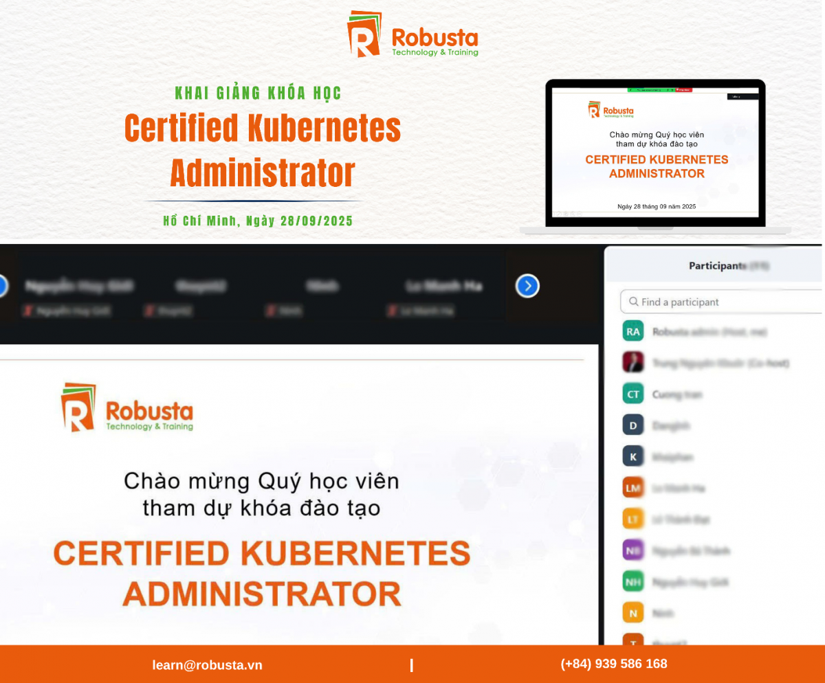 Do nhu cầu cao từ cộng đồng DevOps và quản trị hạ tầng, Robusta đã mở tới hai lớp CKA trong tháng 9/2025. Đây là minh chứng cho xu hướng chuyển dịch mạnh mẽ sang container orchestration trong doanh nghiệp, cũng như sự tin tưởng của học viên vào chất lượng đào tạo của Robusta.