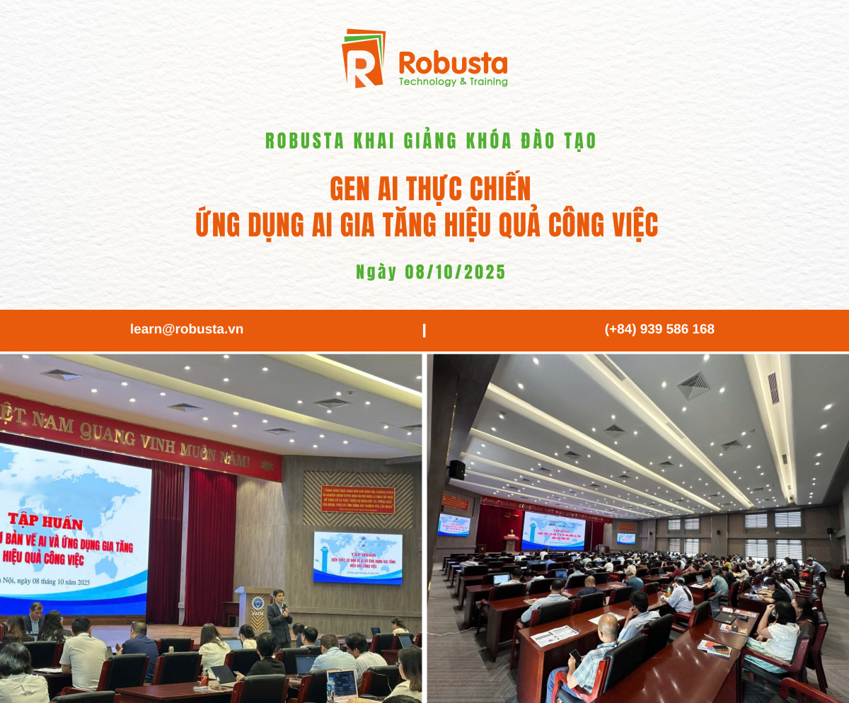 Gần đây, Robusta đã triển khai thành công khóa học “Gen AI Thực Chiến – Kiến thức cơ bản AI và Ứng dụng gia tăng hiệu quả công việc” và “Gen AI Thực Chiến – Ứng dụng AI hiệu quả” cho các đơn vị quản lý trong lĩnh vực hàng không tại Việt Nam.